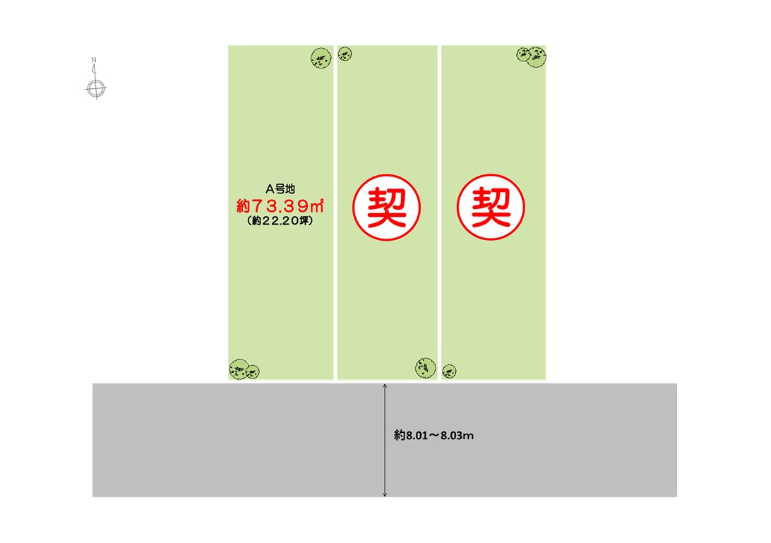 | 土地面積 | A号地 約73.39㎡(約22.20坪) B号地 約69.11㎡(約20.90坪) C号地 約72.87㎡(約22.04坪) |