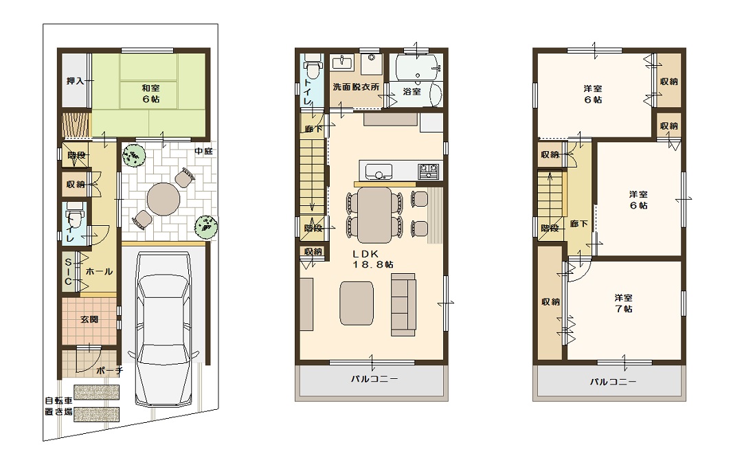 | 土地面積 | A号地:約64.33㎡(約19.45坪) B号地:約63.90㎡(約19.32坪) C号地:約62.74㎡(約18.97坪) D号地:約62.74㎡(約18.97坪) E号地:約62.74㎡(約18.97坪) |